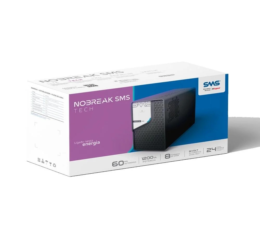 Nobreak SMS Tech 1200 BI com 1200 VA de potência, tensão fixa de 115V, proteção contra quedas e picos de energia, ideal para proteger computadores, equipamentos eletrônicos e sistemas de automação.